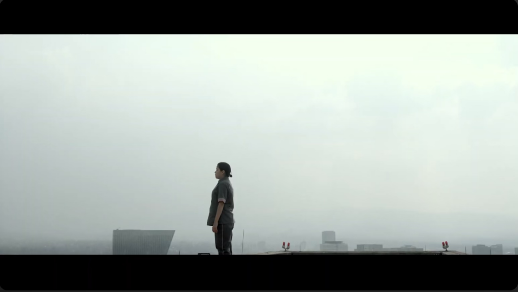 Pour redescendre, elle brouille les normes en utilisant un autre ascenseur, celui qu’empruntent les client·es. Dans un dernier plan ouvert, elle sort de l’hôtel, observée à distance par la caméra restée dans le hall, on la regarde un instant s’éloigner, comme libérée, de l’autre côté des portes vitrées. Ce départ, à la fois discret et symbolique, suggère une possible libération, sans pour autant offrir de résolution narrative claire.