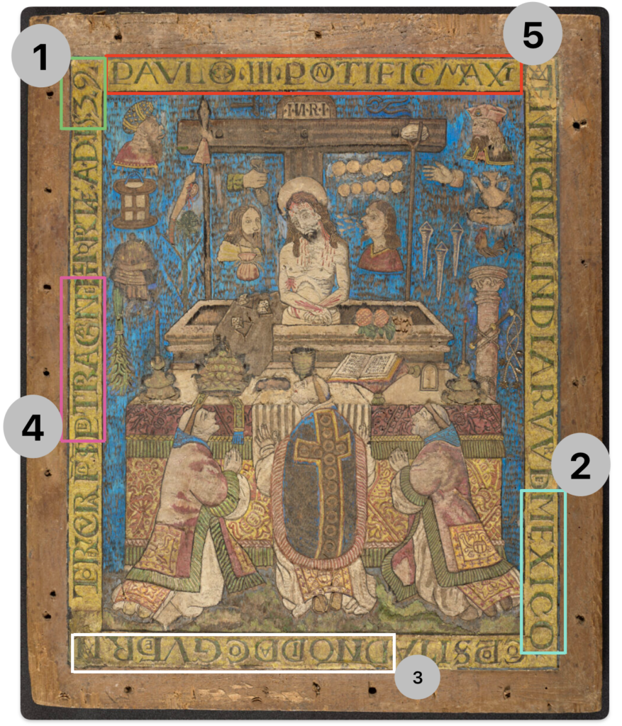 « PAULO III PONTIFICI MAXIMALE / IN MAGNA INDIARUM URBE MEXICO / COMPOSITA DOMINO DIDACO GUBERNA-/ MENTORI CURA FRATIS PETRI A GANTE MINORITÆ A.D. 1539 »