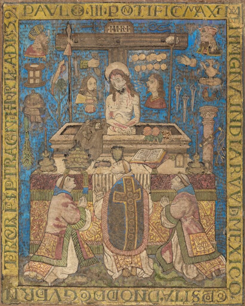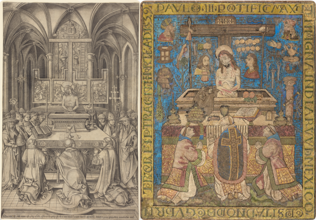 À droite: Pierre de Gand (sous la direction de) (1539), La Messe de Saint-Grégoire [plumasserie], Musée des Amériques, Auch, France.
