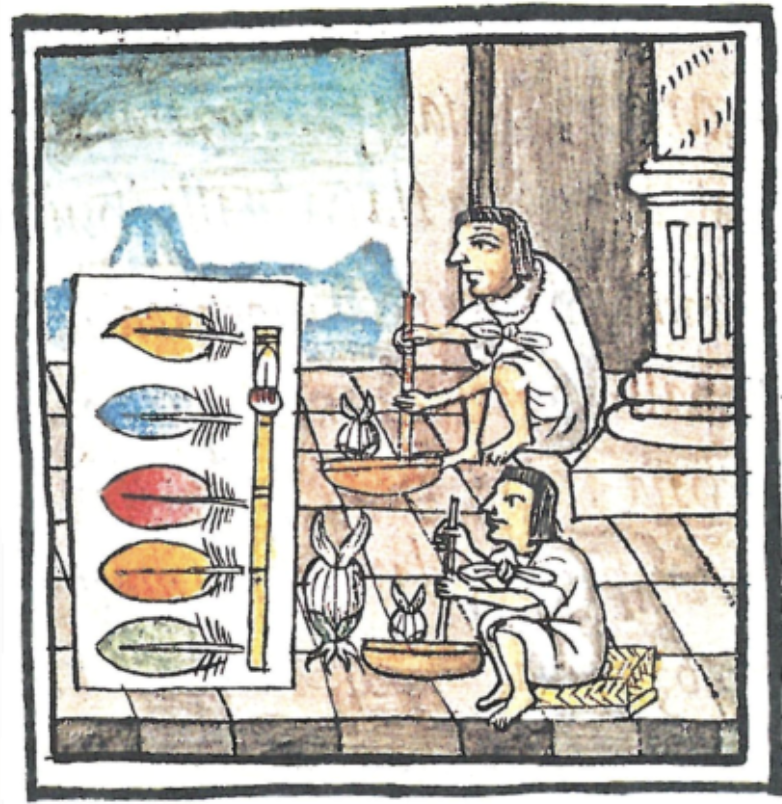 Les plumes étaient coupées en petits morceaux, souvent de quelques millimètres, trempées dans la colle d’orchidées et déposés soigneusement. Elles étaient choisies minutieusement en fonction de leurs qualités chromatiques et physiques ; celles de colibris ou de quetzals étaient très précieuses. Nous connaissons les techniques et l’importance de la plumasserie à travers les manuscrits des missionnaires du XVIe siècle comme Bernardino de Sahagún.