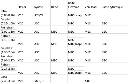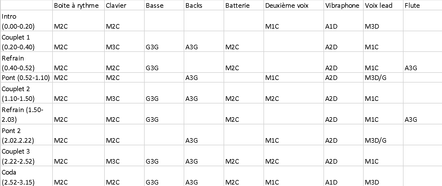| Voix Chœurs Backs Harm | 3 Backs | 3 Tierces sur la 2nde moitié | 3 | 3 Harmo tout le long | 3 | 3 Backs de Chloe | 3 | ||